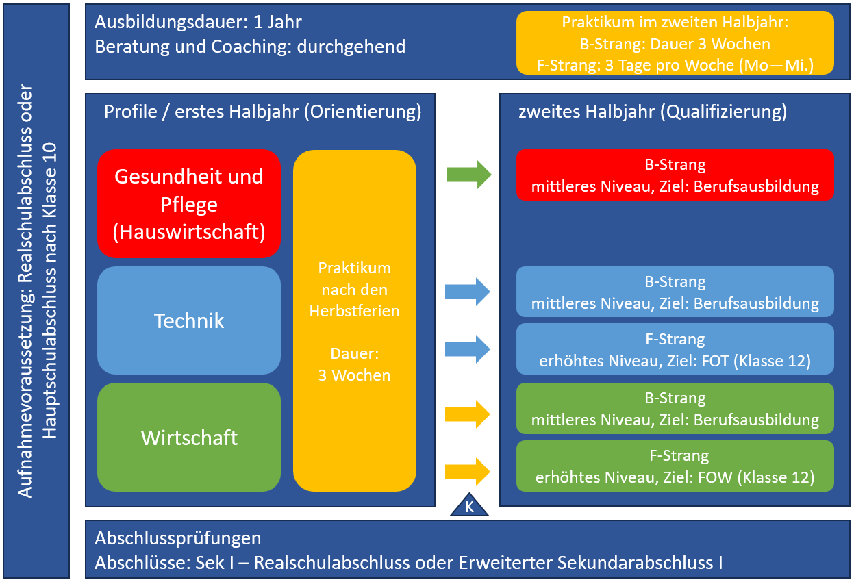 Im ersten Halbjahr lernen Sie das gewählte Profil kennen. Im zweiten Halbjahr bereiten Sie sich auf eine berufliche Ausbildung (B-Strang) oder den Besuch der Fachoberschule Klasse 12 (F-Strang) vor.